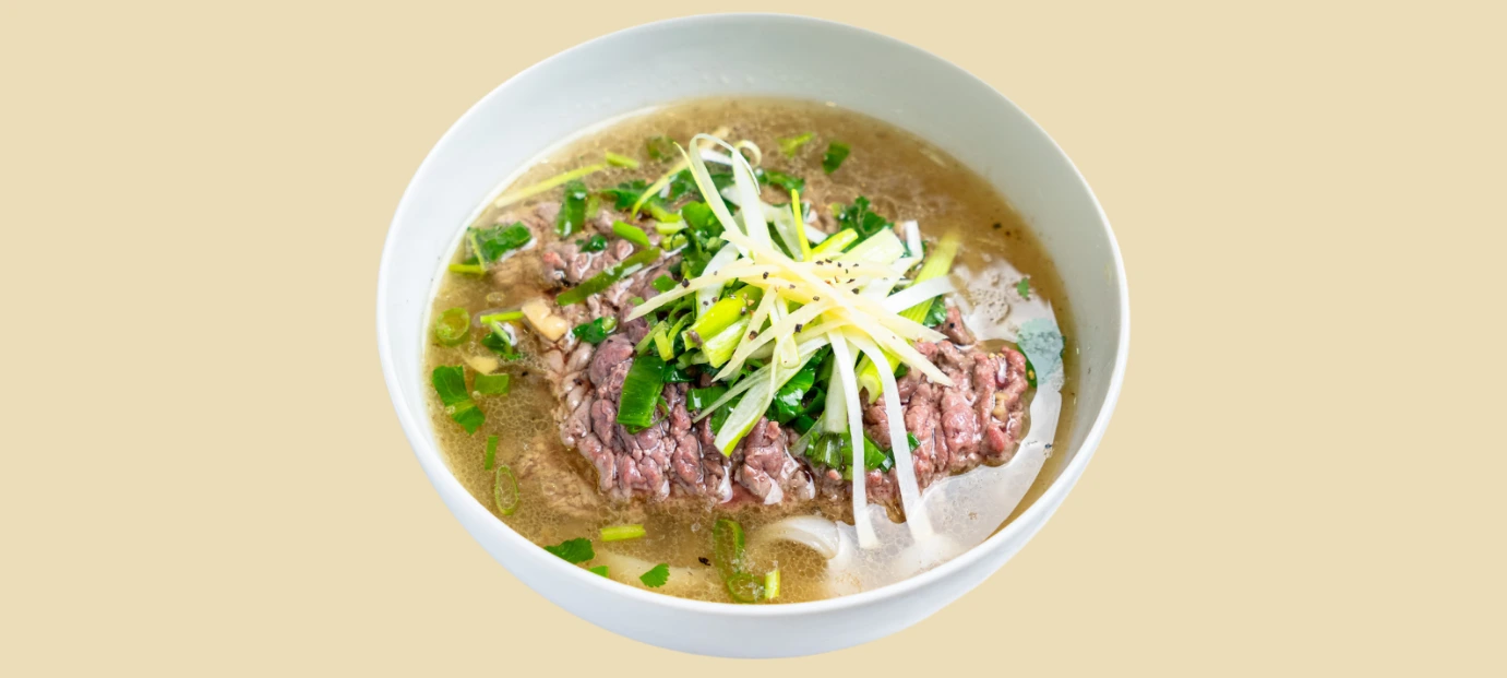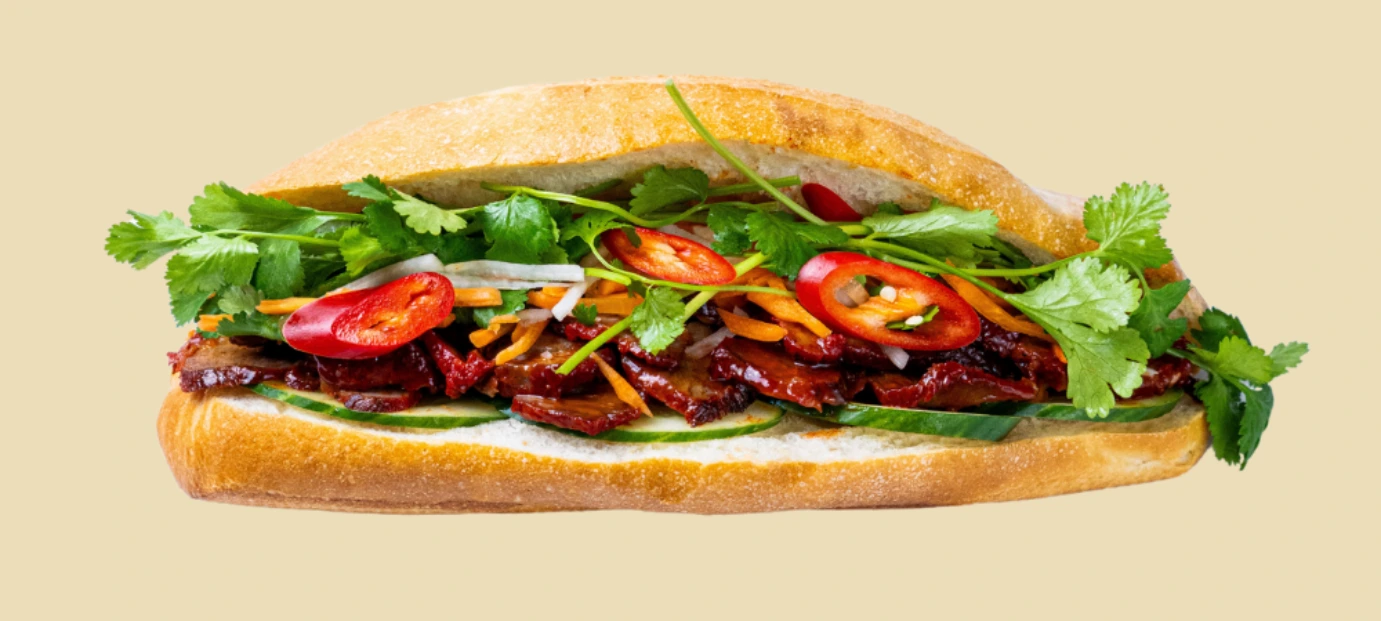 Vietnamesisches Sandwich mit knusprigem Baguette, bestrichen mit Leberpaté aus Schwein, Mayonnaise, frischen Gurken, eingelegtem Daikonrettich und Karotten, Chilis und Koriander. Ein harmonischer Genuss aus verschiedenen Aromen, Kräutern und Texturen.